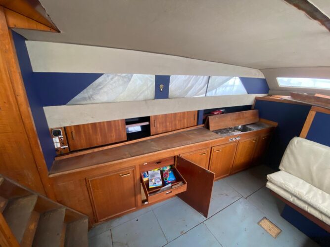 Mein Vater hatte die Yacht für seinen Ruhestand gekauft um sie zusammen zu renovieren. Seit dem steht sie mehreren Jahre auf dem Trockenen. Nach einer ersten instandsetzung hatte mein Vater gesundheitlich so abgebaut, dass sie seit dem nicht weiter gepflegt wurde.