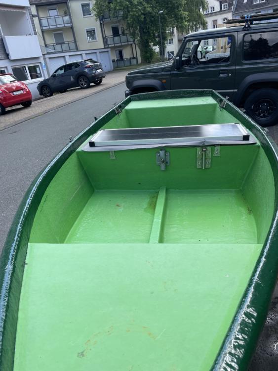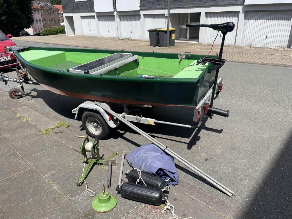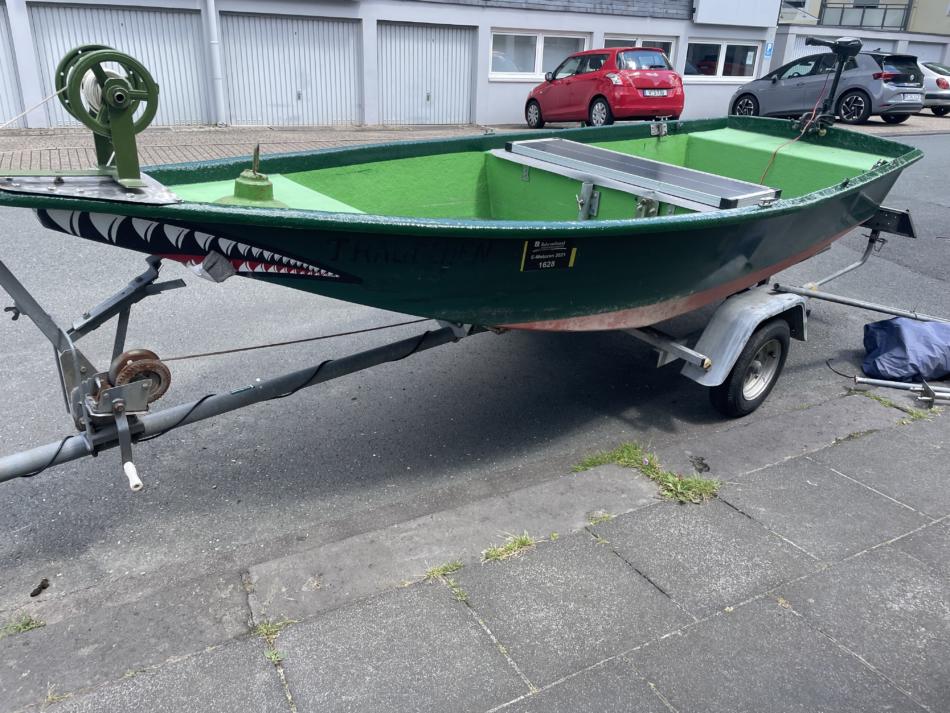 Hallo, ich biete eine tolles und großes Angelboot mit Trailer an. Das Boot ist ca 4m lang und 1,50m breit. Es hat folgendes Zubehör: