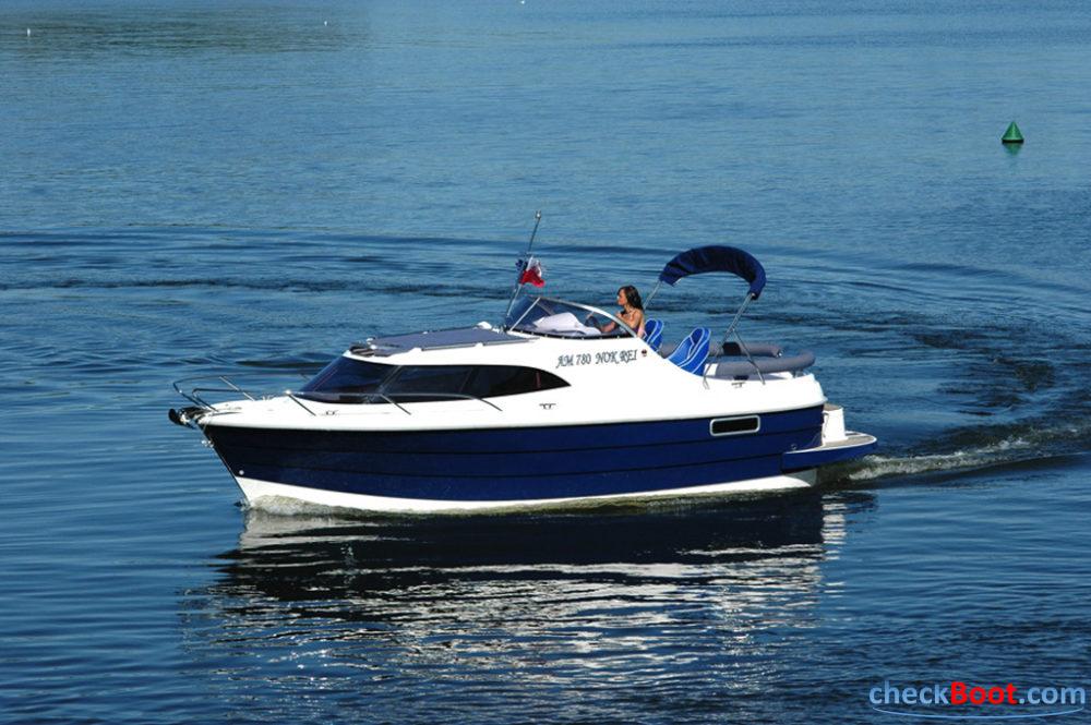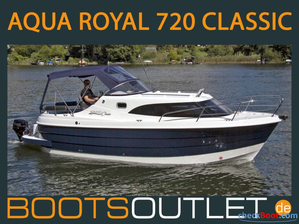 Die Aquaroyal 720C ist ein klassisch gestylter Halbgleiter und bietet mit seinen 2 Kabinen genügend Unterbringungsmöglichkeiten für 5 Personen. Aufgrund seiner Maße ist das Schiff sehr manövrierfreundlich und unter anderem hervorragend für die Unterbringung in Boots schuppen, sowie zum Transport auf Trailern geeignet. Da Sie unter mehreren Antriebsvarianten wählen können, eignet sich das Schiff sowohl zum Wasserwandern in Flüssen, Kanälen und Binnengewässern als auch für lebhaftes Küstenkreuzen. Das neu designte Schiff lässt keine Wünsche offen. Die Aquaroyal 720 Classic wurde bereits zum Boot des Jahres in England (London) gekürt. Die geschmackvoll gestaltete Plicht, mit ihrer großen Rundsitzecke, verleiht Platzkomfort für 6 Personen für ein gemeinsames Dinner unter freiem Himmel oder unter dem großzügig gestalteten Caprioverdeck. Auf dem Vorschiff, welches über die breit designten Gangboarden sicher zu erreichen ist, können Sie es sich auf einer großen, gepolsterten Liegewiese, bei einer sonnigen Kanalfahrt bequem machen. An regnerischen Tagen bietet der sehr geschmackvoll gestaltete Salon viel Platz für alle Passa-giere. Die sehr geräumige und praktische Pantry mit einer Spüle, integriertem zweiflammigen Kocher und 40 Liter Kühlschrank lässt kein Wünsche offen. Die groß-zügig geschnittene Unterflurkoje, in der man durch zwei integrierte Fenster von der Morgensonne geweckt wird, bietet Schlafkomfort für zwei erwachsene Personen. Die separate Nasszelle ist mit einem Pump-WC und einem Eckwaschbecken mit integrierter Duschamatur ausgestattet. Ein Warmwasserboiler, ein Umformer für 230V-Steckdosen und ein Landanschluss sind selbstverständlich auf Wunsch erhältlich.