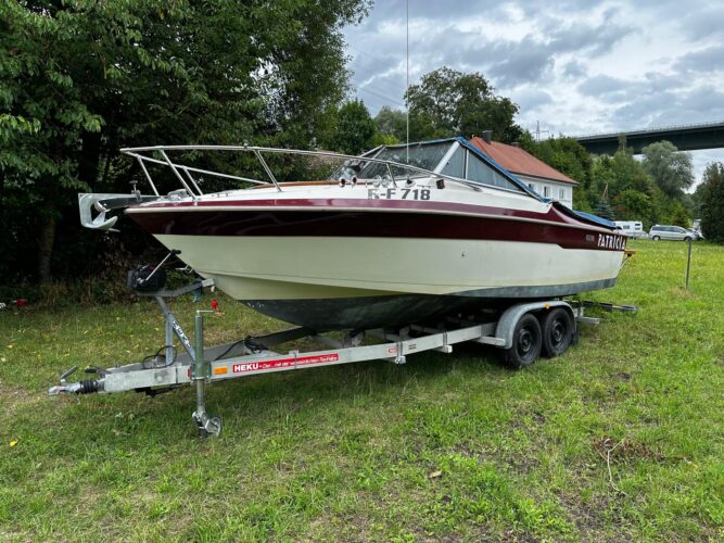 6,23 m, neuer Rumpfmotor 5.7l V8 260PS, Antrieb erneuert, Simmering neu, 2 neue 100 Ampere Batterien, Generator und Zündleitungssatz neu, Motorsteuergerät neu, Umrüstung von mechanischer auf elektrische Benzinpumpe neu, Leder vom Sattler überarbeitet, 200l Tank, Echolot, Drehzahlmesser, Holzlenkrad, Kabine in Mahagoni 5sitzer, Liegefläche, neues Badebrett, Anker und Ankerkette neu 30m elektrisch mit Fernbedienung, bis -46 Grad eingewintert, wurde nur im Süßwasser benutzt (Salzwasser geeignet!), weniger als 900 Betriebsstunden gesamt, Zulassung Regensburg, gebremster Heku-Anhänger mit wasserdichten Radnaben (grünes Kennzeichen, TÜV neu). Preis VB.