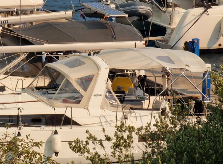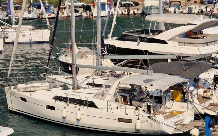 Die Beneteau Oceanis 41.1 (41 Fuß, 12,34 Meter) ist mit 3 Kabinen ideal für kleinere Crews oder Familien. 2 komfortable Bäder bieten ausreichend Platz und Privatsphäre. Die elektrisch absenkbare Badplattform erleichtert den Ein- und Ausstieg sowohl an Land als auch zum Baden im glasklaren Wasser der Adria. An beiden Steuerständen sind die Daten des Chartplotters ablesbar. Bei der Oceanis 41.1 wurde im Cockpit Teak verlegt. Ein 570 Liter fassender Wassertank macht einen längeren Aufenthalt in Buchten möglich, ohne an Land zu müssen. Heizung sowie elektrischer Ventilatoren in Salon und Kabinen.