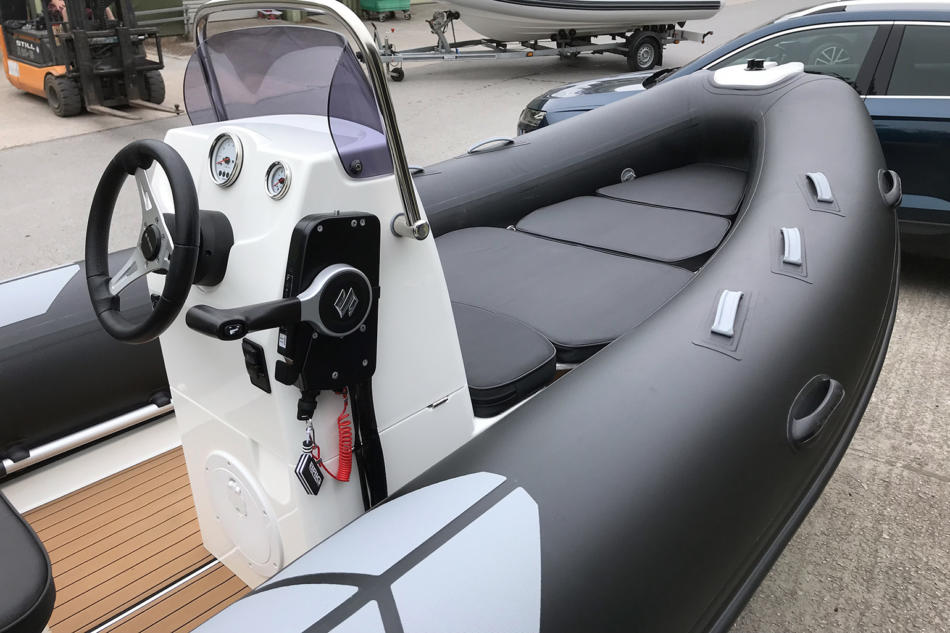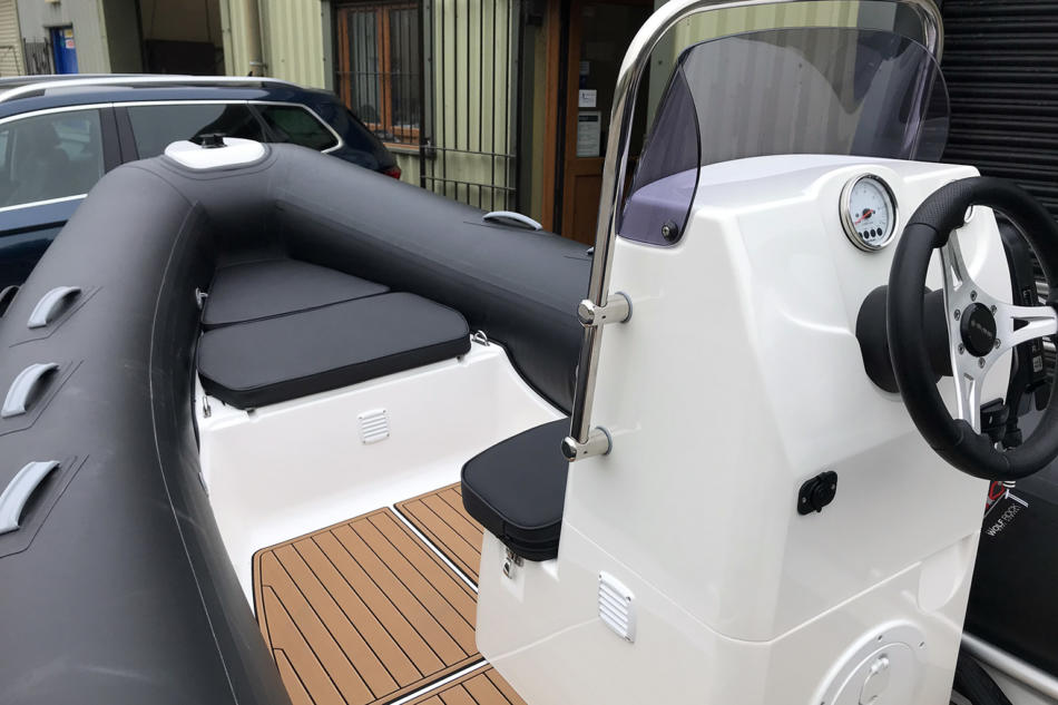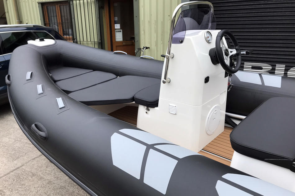 Schwarzer Schlauch, Weißes Oberdeck, Schwarzes Unterwasserschiff, Anthrazite SilverTex-Polster, Bodenbelag Mocca mit Schwarzen Fugen