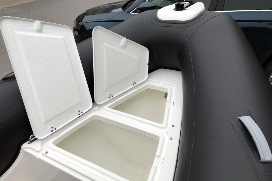 mit folgenden Extras: Polster – Bug, Polster – Sonnenliege, GFK – Bugbeschlag, Geräteträger mit Beleuchtung, Abdeckplane, Überdruckventil und SeaDek – Bodenbelag