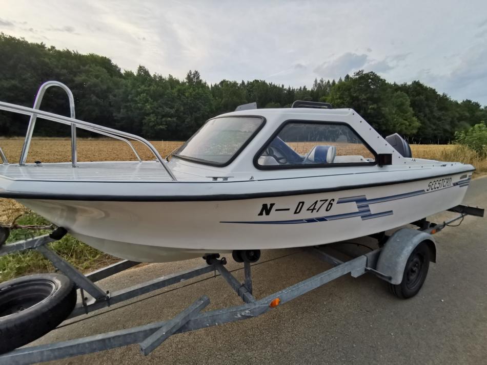 Angeboten wird unsere Hille Roda 16 mit Yamaha 50 PS 2 Takt Motor zusammen mit einem Trailer von Harbeck.