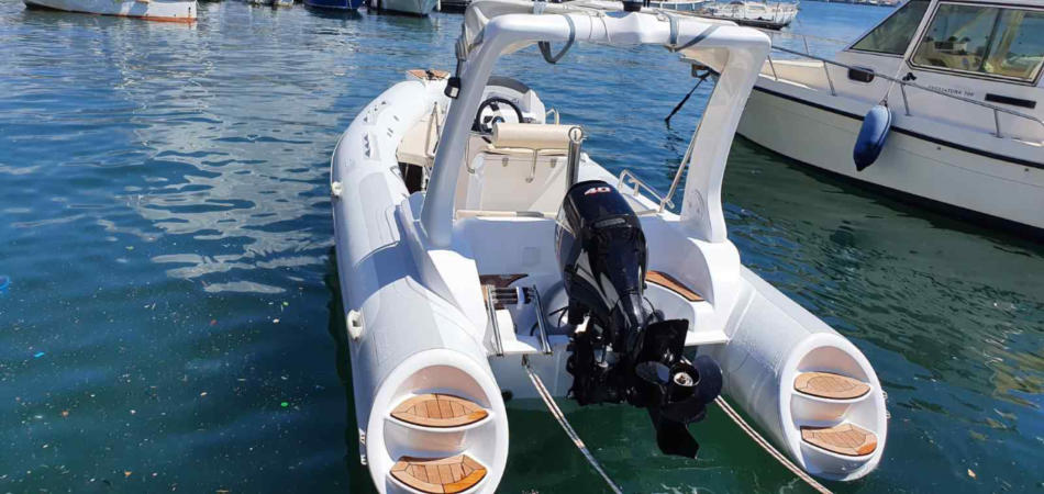 Das Rib hat einen doppellagigen Fiberglas Rumpf mit zusätzlicher Heckspiegelplatte zur Befestigung des Außenborders. Als Schlauchmaterial kommt hier hochwertiges PVC 1,2 mm zum Einsatz.