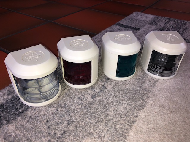 Steuerbord, Backbord, Top und Hecklaterne kompletter und wirklich sehr guter Zustand mit Beleuchtungsbirnen, für die Toplaterne hätte ich noch eine Hochwertige Chromstahlhalterung wenn gewünscht! jede Lampe je 25.- Chromstahl Halterung 35.-