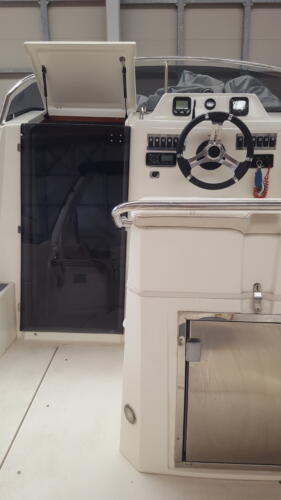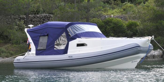 Kajütdach in Material sunbrella blau, Mückennetze, Fenster in Klarglas um auch in geschlossenem Zustand 360 ° Rundumsicht zu ermöglichen, vielzählige Möglichkeiten zur Öffnung oder Verschließen komplett oder teilweise.