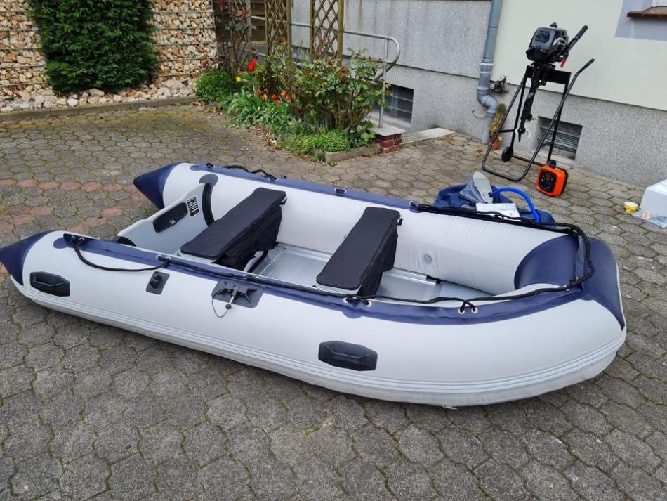 Für 4 Personen, Inklusive Luftpumpe, 2 Paddel, Extra Tragetasche & -Griffe, Außenbordmotor geeignet