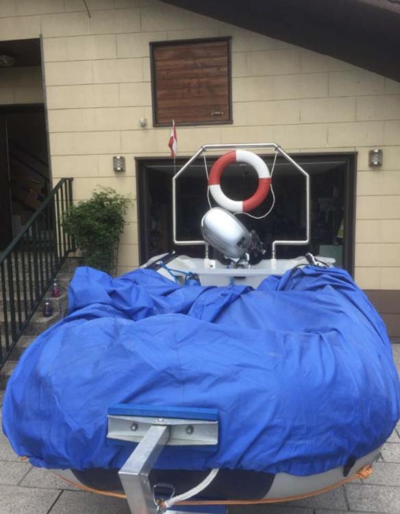 Ein „Geräteträger“ wurde in Eigenregie dazugebaut, darauf ist der Rettungsring, Fahnenstange sowie der Sonnenschutz (Bimini) montiert. Inkl. Abdeckplane für das gesamte Boot.