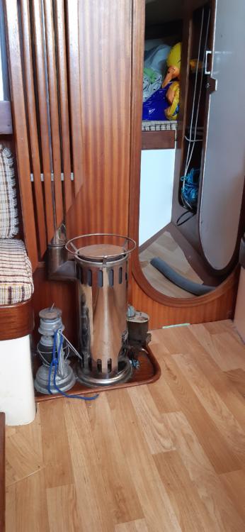 Reflexs Dieselofen mit Kochplatte und Schornstein mit Holzverkleidung (der Kamin an Deck ist demontierbar)