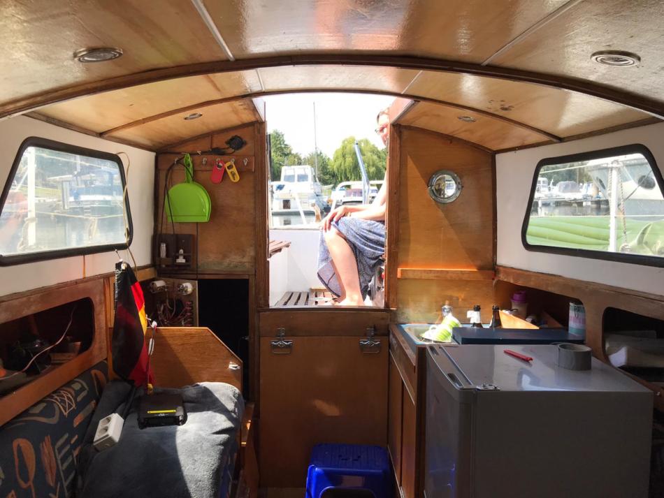 Der Vorgänger hat vor einem starken Regen zwei Abläufe der Luke nicht frei gemacht, so dass dort die Sperrholzdecke Wasserflecken hat. Eine Sperrholzplatte hat er uns mitgegeben, wer mag kann die haben, uns hat es nicht gestört und sicherlich tut es auch ein wenig Farbe.