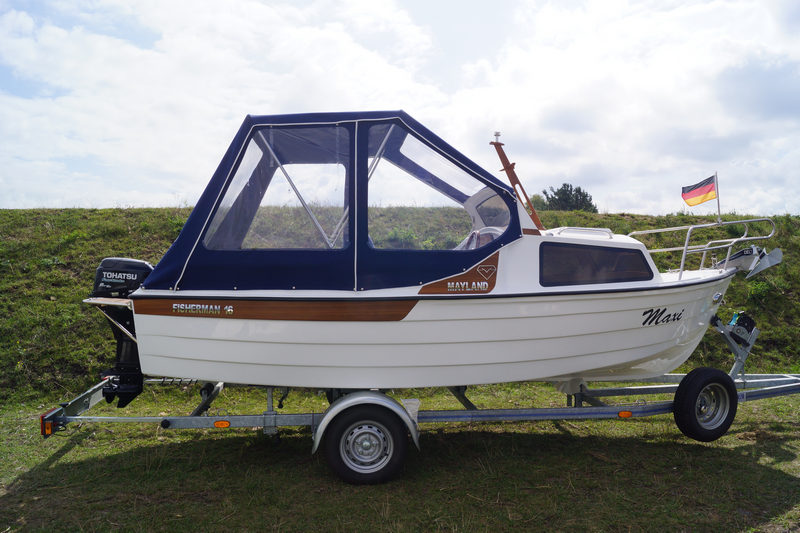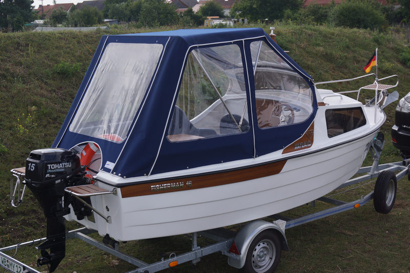 Angeboten wird ein Vorführboot in der Vollausstattung mit 15 PS Tohatsu- Motor und 100 Km/h Straßentrailer.